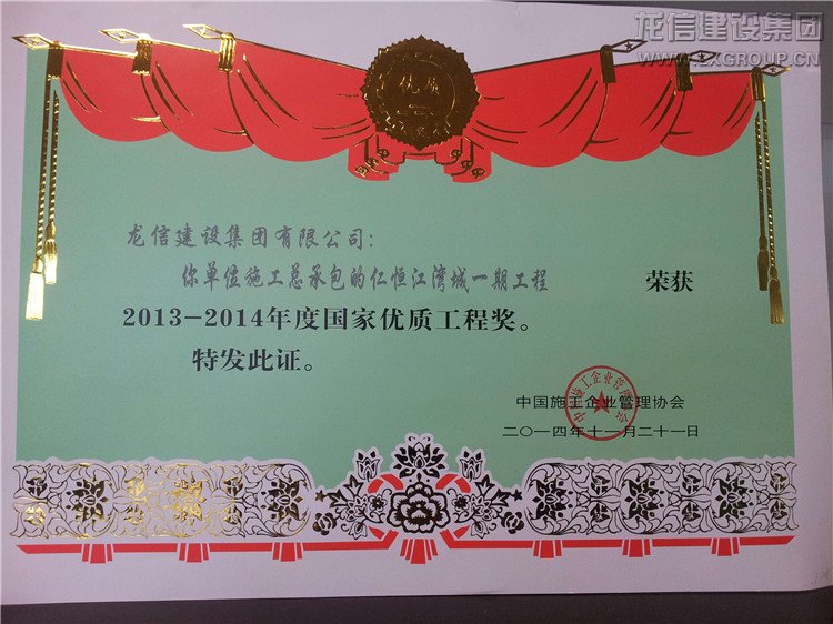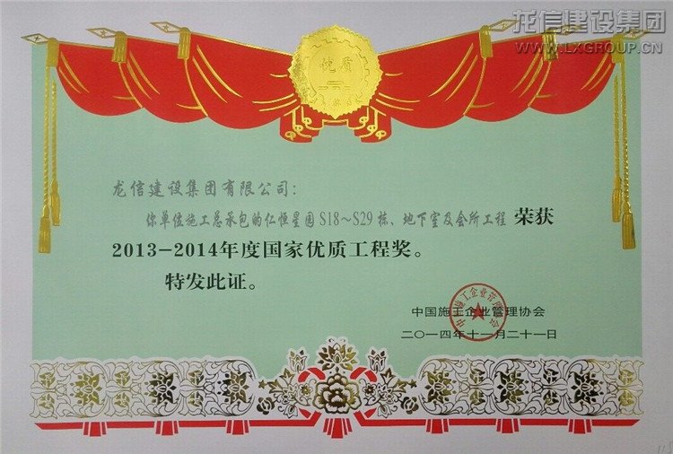 近日公司承建的“仁恒星園S18~S29棟、地下室及會所”、“仁恒江灣城一期工程”喜獲2013-2014年度“國家優(yōu)質工程獎”,子公司江蘇紫浪裝飾裝璜有限公司承建的海門市東恒盛國際大酒店裝飾工程獲“2013-2014年度全國建筑工程裝飾獎”。